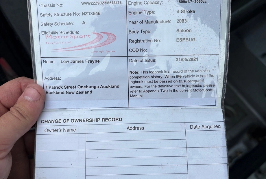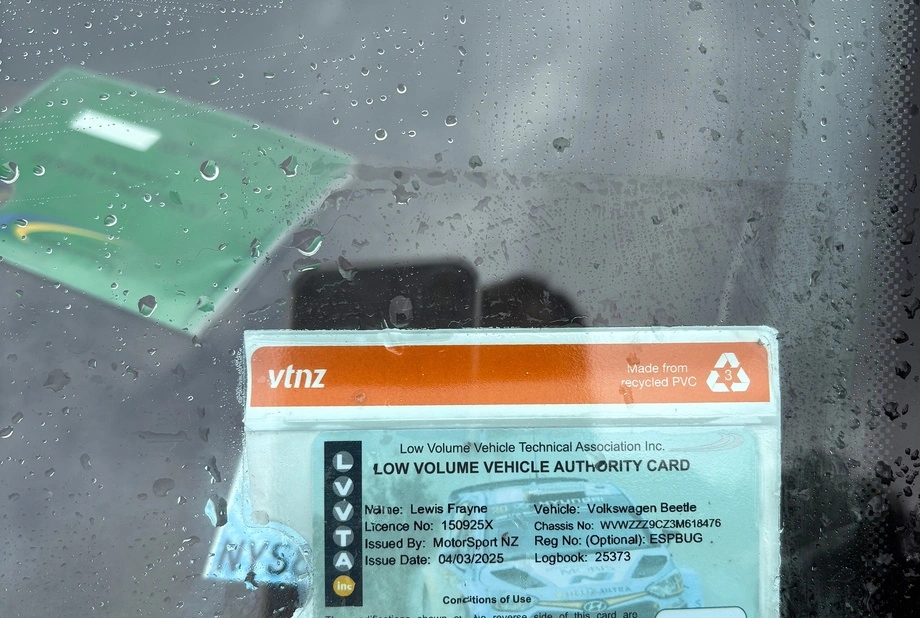 MSNZ Authority Card for road use which includes the seats, harnesses, airbag removal and roll cage. (Door cards to be replaced)